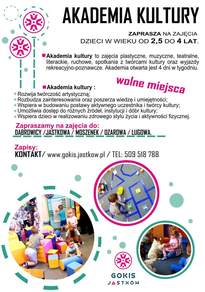 Zapraszamy mieszkańców gminy Jastków do aktywnego uczestnictwa w zajęciach Akademii Kultury. Szczególnie zachęcamy dzieci w wieku 2,5 - 4 lat, które pod okiem wykwalifikowanej  kadry  będą mogły rozwijać swoje umiejętności oraz pogłębiać wiedzę w zakresie szeroko pojętej edukacji kulturalnej. Akademie funkcjonują cztery raz w tygodniu w miejscowościach: Dąbrowica, Jastków, Ługów, Moszenki, Ożarów.  Zapisy prowadzi Gminny Ośrodek Kultury i Sportu ( tel. 509-518-788) oraz instruktorki w danych Akademiach. Szczegóły na stronie www.gokis.jastkow.pl