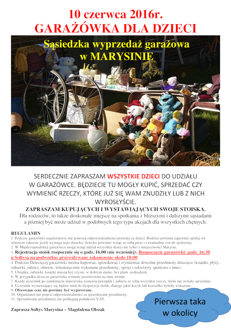 10 czerwca 2016 r. "GARAŻÓWKA DLA DZIECI" Sąsiedzka wyprzedaż garażowa w Marysinie