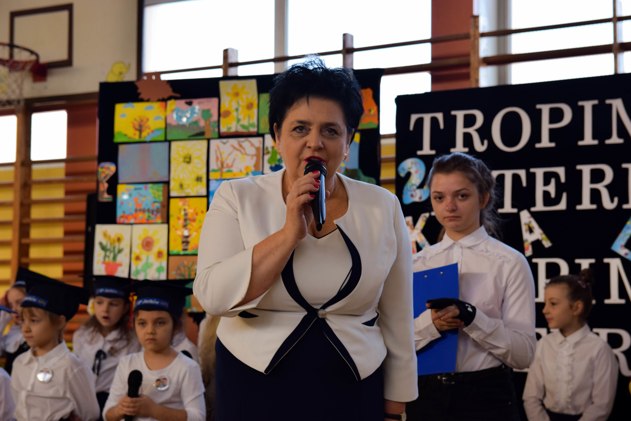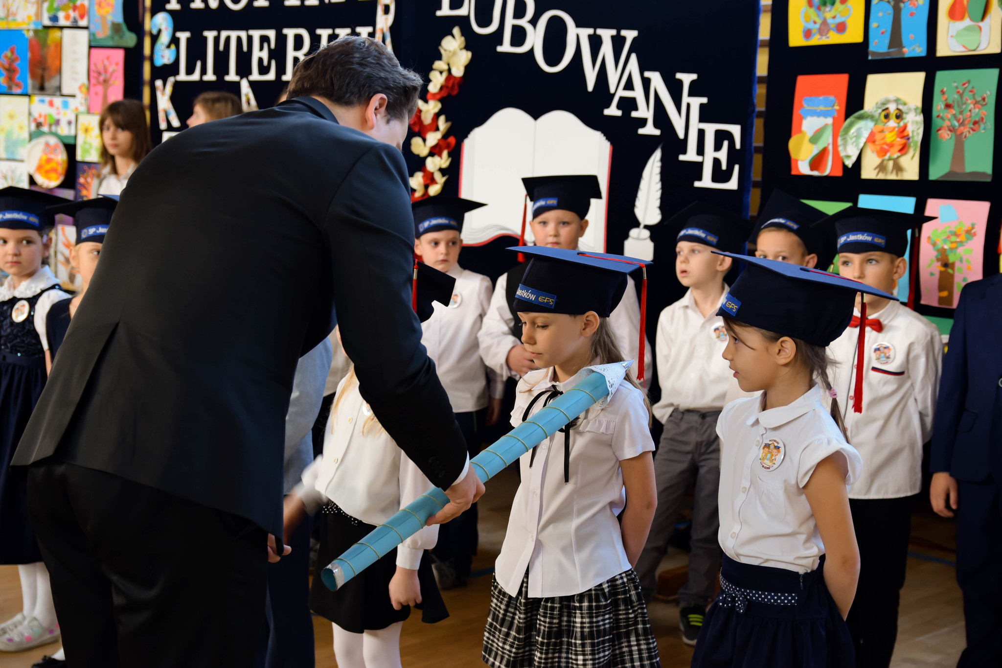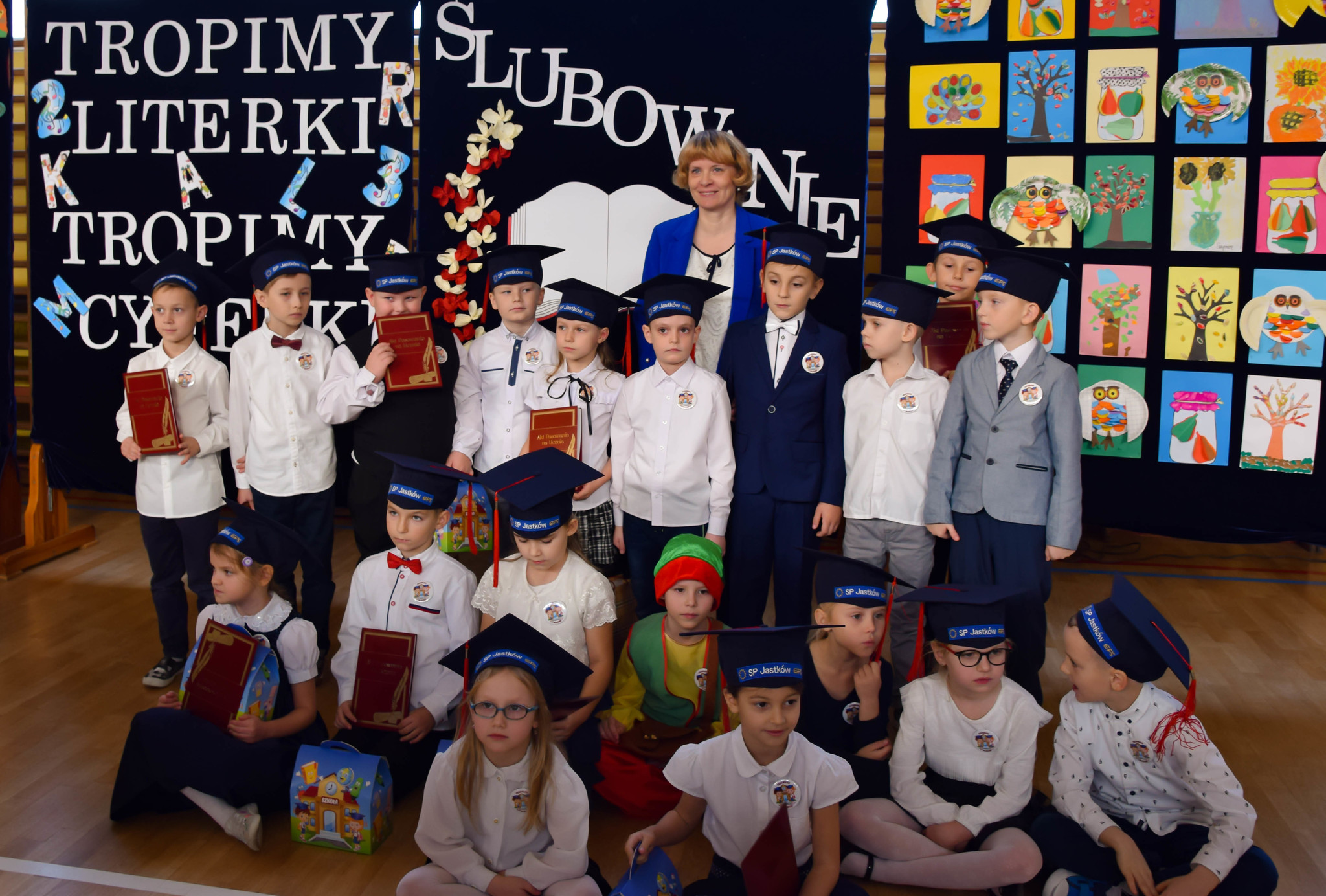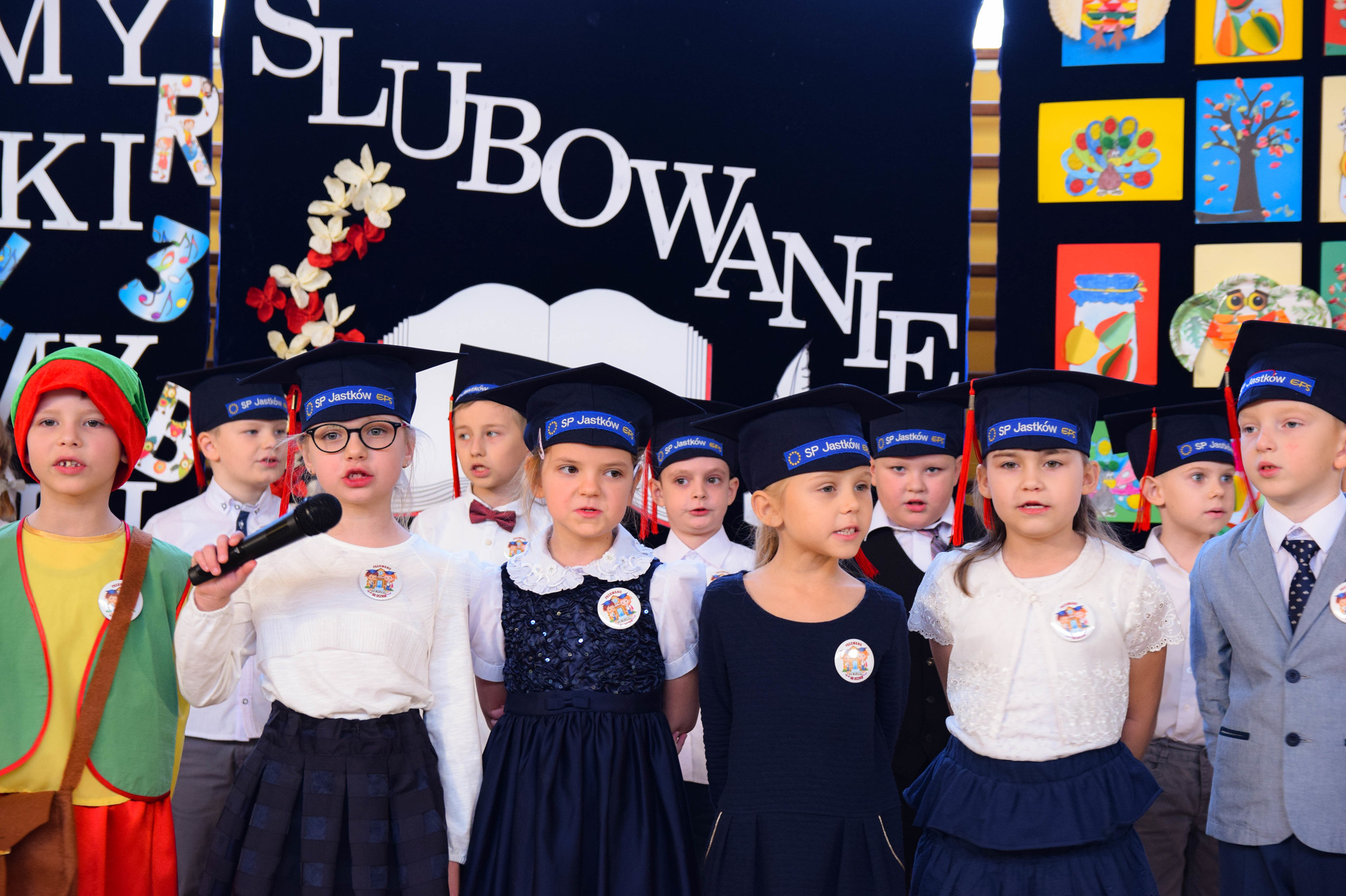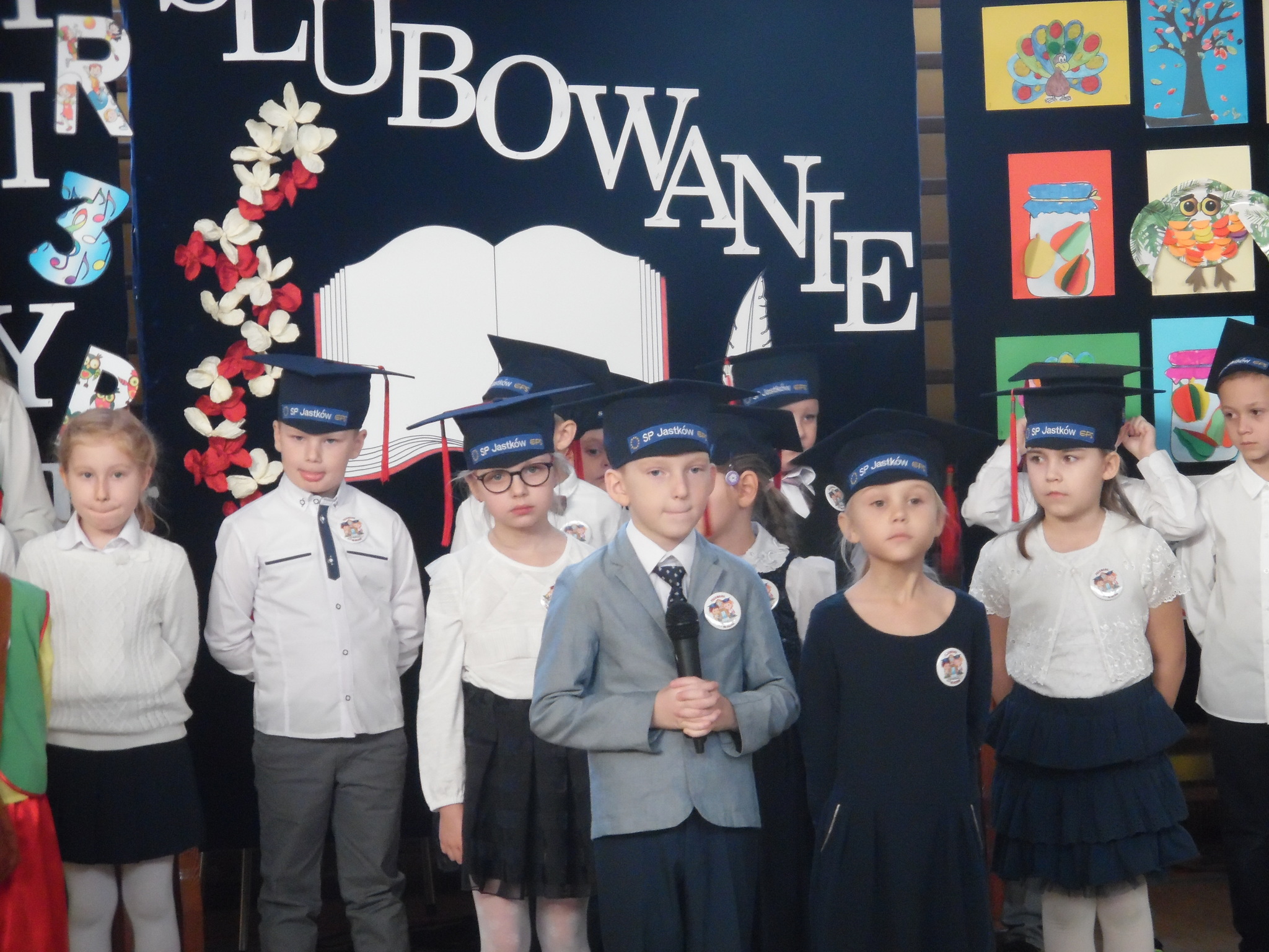 Najważniejszym momentem tej uroczystości było uroczyste ślubowanie i pasowanie na uczniów, którego dokonali: Pani Dyrektor Ewa Depta i Zastępca Wójta Gminy Jastków, Pan Andrzej Dec.