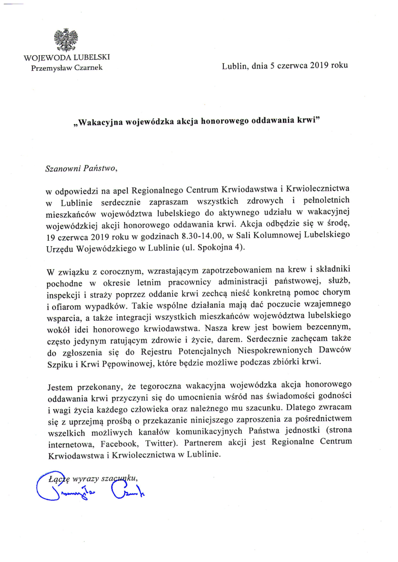 ZAPRASZAMY DO UDZIAŁU W WAKACYJNEJ WOJEWÓDZKIEJ AKCJI HONOROWEGO ODDAWANIA KRWI W DNIU 19.06.2019 r., W GODZ. 8.30 – 14.00 W LUBELSKIM URZĘDZIE WOJEWÓDZKIM UL. SPOKOJNA 4