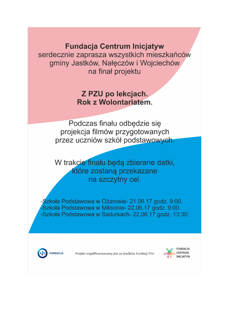 Dobiegł końca projekt "Z PZU po lekcjach ,,Rok z wolontariatem". Z tej okazji uczniowie nagrali specjalne filmy, których projekcja odbędzie się w ostatnim tygodniu roku szkolnego. Wydarzenia będą miały charakter charytatywny- w trakcie projekcji filmów i podsumowania projektu odbędą się zbiórki datków na Schronisko dla Bezdomnych Zwierząt w Puławach oraz Szpital Dziecięcy w Lublinie. Projekcje filmów odbędą się: 21 czerwca o godz. 9.00 w Szkole Podstawowej im. Anny i Andrzeja Nowaków w Ożarowie, 22 czerwca o godz. 9.00 w Szkole Podstawowej im. Polskich Olimpijczyków w Miłocinie oraz 22 czerwca o godz. 13.30 w Szkole Podstawowej im. Bolesława Prusa w Sadurkach. Zapraszamy serdecznie wszystkich zainteresowanych. Projekt "Z PZU po lekcjach", współfinansowany jest przez Fundację PZU i realizowany przez Fundację Centrum Inicjatyw.