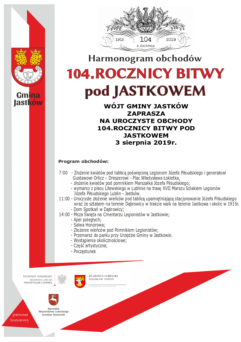11:00 - Uroczyste złożenie wieńców pod tablicą upamiętniającą stacjonowanie Józefa Piłsudskiego wraz ze sztabem na terenie Dąbrowicy w trakcie walk na terenie Jastkowa i okolic w 1915r.