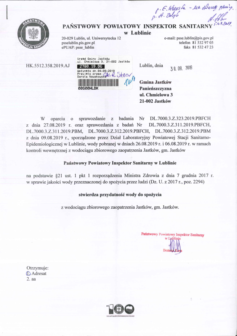 SPAWOZDANIA Z BADAŃ PAŃSTWOWEGO POWIATOWEGO INSPEKTORATU SANITARNEGO Z DN. 30.08.2019 R.