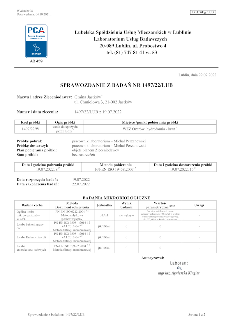 SPRAWOZDANIE Z BADAŃ NR 1497/22/LUB