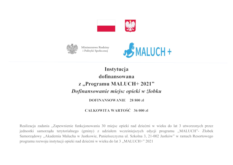 INSTYTUCJA DOFINANSOWANA Z „PROGRAMU MALUCH+ 2021” DOFINANSOWANIE MIEJSC OPIEKI W ŻŁOBKU