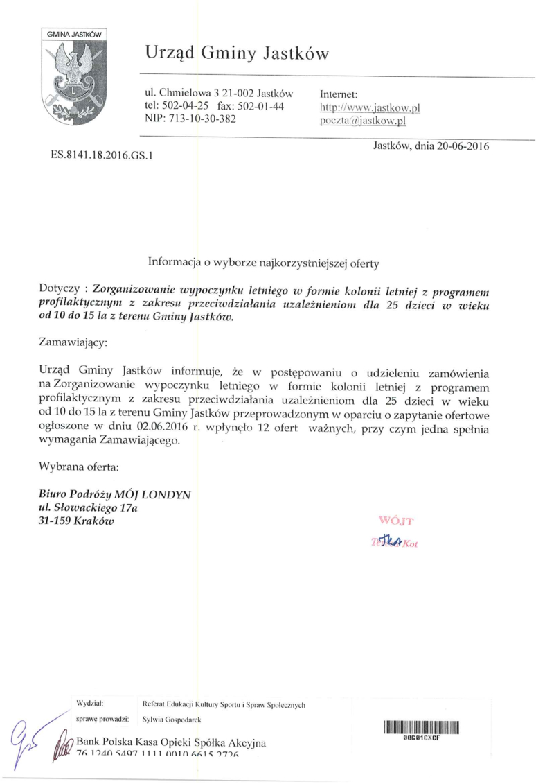Informacja o wyborze najkorzystniejszej oferty na Zorganizowanie wypoczynku letniego w formie kolonii letniej z programem profilaktycznym z zakresu przeciwdziałania uzależnieniom dla 25 dzieci w wieku od 10 do 15 la z terenu Gminy Jastków.