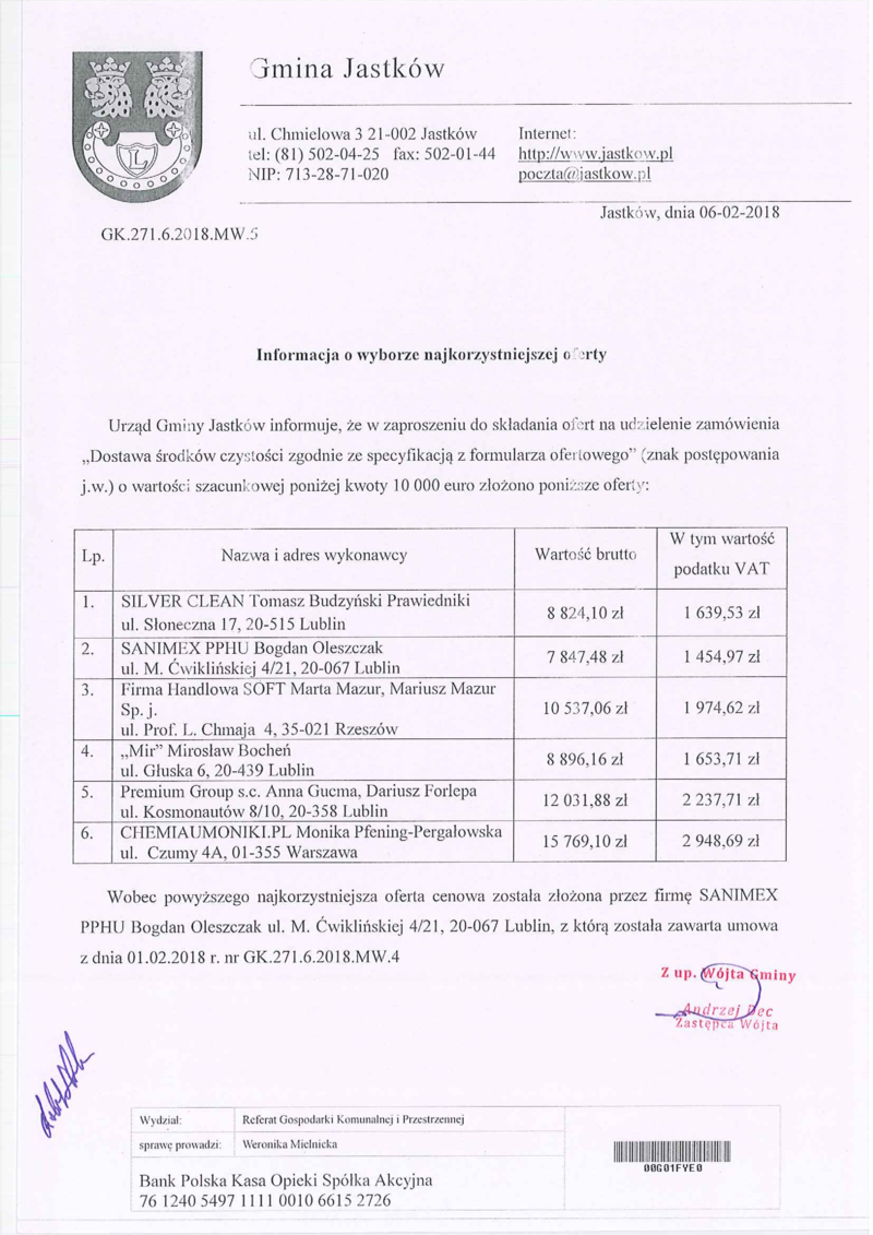 INFORMACJA O WYBORZE NAJKORZYSTNIEJSZEJ OFERTY