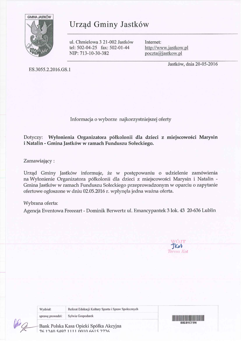 Informacja o wyborze najkorzystniejszej oferty Wyłonienia Organizatora półkolonii letnich dal dzieci z miejscowości Marysin Natalin – gmina Jastków w famach Funduszu Sołeckiego.