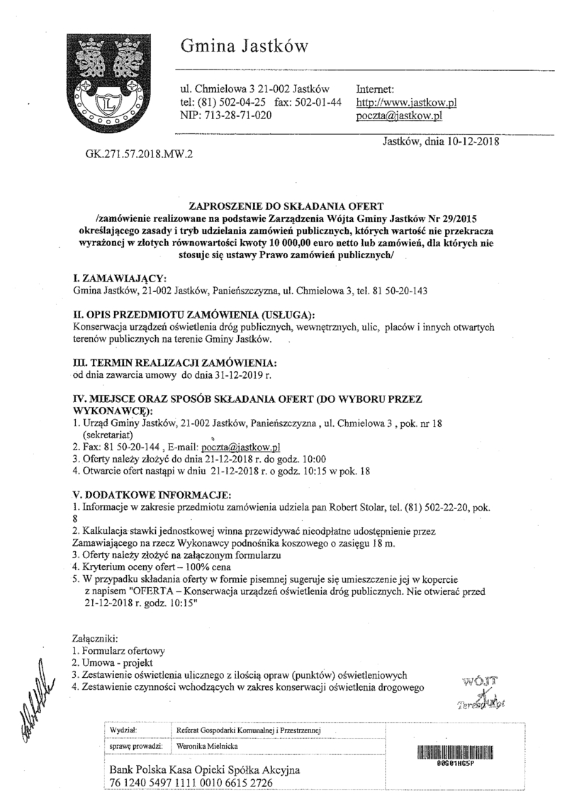 Komunikat w sprawie zaproszenia do składania ofert na konserwację urządzeń oświetlenia dróg publicznych, wewnętrznych, ulic, placów i innych otwartych terenów publicznych na terenie Gminy Jastków z dnia 10.12.2018 r. (znak sprawy – GK.271.57.2018.MW.2) – Gmina Jastków uprzejmie informuje, że uległ zmianie załącznik nr 3 – zestawienie oświetlenia ulicznego z ilością opraw (punktów) oświetleniowych.
