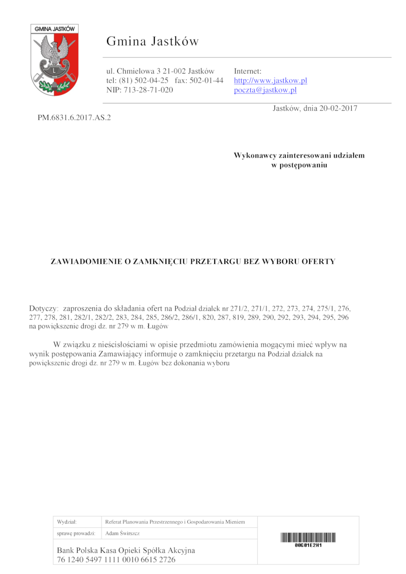 ZAWIADOMIENIE O ZAMKNIĘCIU PRZETARGU BEZ WYBORU OFERTY Z DNIA 20.02.2017 R.